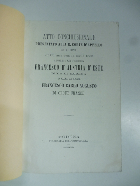Atto conchiusonale presentato alla R. Corte d’appello in Modena all’Udienza delli 11 luglio 1865 a nome di S. A. R. l’arciduca Francesco d’Austria d’Este duca di Modena in causa col signor Francesco Carlo Augusto di Crouy-Chanel