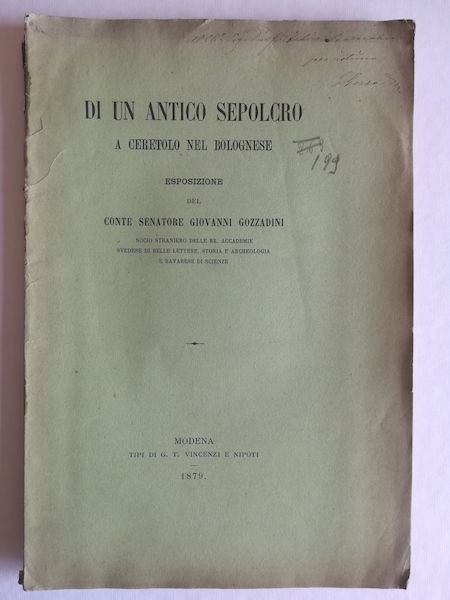 In 8 (cm 17 x 24,5), pp. 33 + (1b) con bella tavola finale ripiegata incisa in litografia con 3 figure raffigurante un vaso in bronzo con figura femminile ritrovato in un sepolcro di Cereto nel Bolognese. Lievi danni riparati al dorso. Brossura editoriale con dedica autografa al piatto anteriore.