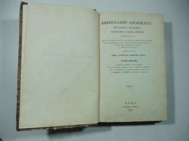 2 volumi legati in uno, in 8, cm 14,5 x 23, pp. 384 + (2); 336. Mezza pelle coeva con qualche danno riparato, segni d’uso ai piatti. Opera più volte ristampata e in questa edizione aggiornata sotto forma di dizionario relativo alle tassazioni di atti, ipoteche, citazioni ecc.