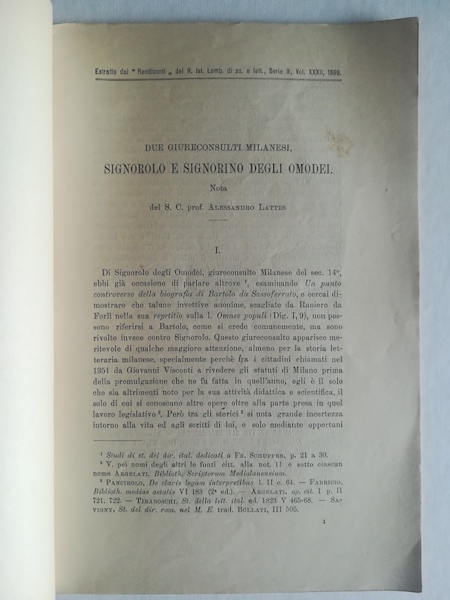 In 8 (cm 16 x 24), pp. 29 + (1b). Omaggio autografo alla prima carta bianca. Brossura muta coeva. Estratto editoriale dai Rendiconti del R. Istituto Lombardo di Scienze e Lettere.