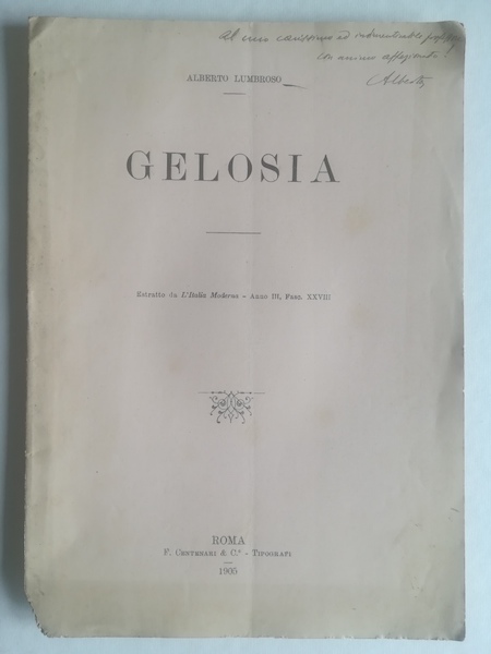In 8 (cm 17 x 24), pp. 7 + (1b). Dedica autografa al frontespizio. Mancanza all’angolo interno inferiore di tutte le pagine. Brossura editoriale. Estratto editoriale da ‘L’Italia moderna’. Racconto di Alberto Lumbroso, nato a Torino nel 1872, dottore in legge, storico, letterato e pubblicista.