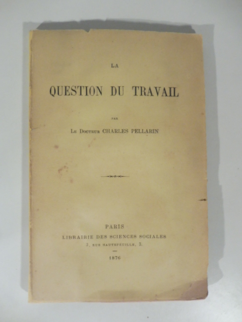 In 16 (cm 12 x 18,5), pp. 71 + (1). Lieve mancanza all’angolo inferiore esterno del piatto anteriore. Brossura editoriale. Edizione originale dell’opera di questo fourierista, socialista utopista, il primo biografo ufficiale di Fourier. Fra gli argomenti dell’opera: La commission d’enquete parlementaire sur le conditions du travail. Examen du Rapport fait au nom de la Commission par M. Ducarre; Le Rapport et les systemes d’organisation du travail; Le Rapport et Turgot; Le Rapport et la delegation ouvriere a l’Exposition de Vienne, ecc…