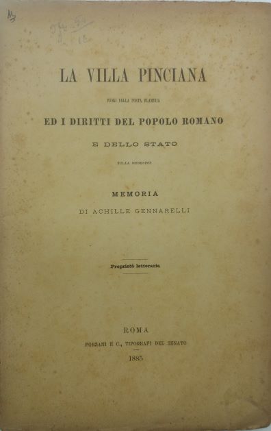 In 8, cm 14,5 x 22,5, pp. 70. Brossura editoriale con lievi danni e bruniture. Rara e interessante memoria contro il tentativo della famiglia Borghese di riappropriarsi dell’uso esclusivo dell’omonimo parco attraverso una disamina storica (in cui non lesina accuse di malcostume a Paolo V ecc.), memorie legali, chirografi ecc.