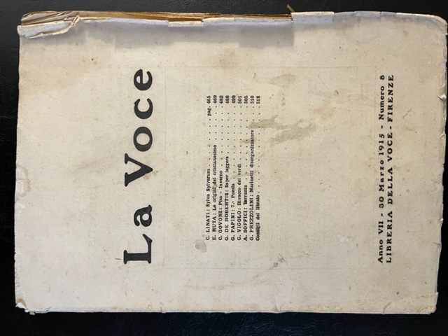 In 8 (cm 18 x 25,5), pagine numerate da 465 a 528. mancanza all’angolo superiore esterno delle pagine da pagina 503 in fine. Brossura editoriale. Numero 8, del 30 marzo 1915, della rivista diretta da Giuseppe Prezzolini fondata nel 1908. Nel 1914 la rivista cambiò formato e periodicità, trasformandosi da giornale settimanale in piccolo fascicolo quindicinale. Sono qui presenti alcune poesie di Corrado Govoni in edizione originale dedicate alla sua visita a Pisa: Pisa-Inverno. Sulla torre pendente; Nel Duomo; Nel Battistero; Nel Camposanto; Per le vie; Alla stazione; un racconto di Ardengo Soffici dal titolo “La terrazza. Periplo dell’uomo e della vita”; un articolo do Prezzolini dal titolo “Marinetti disorganizzatore”; un capitolo di Carlo Linati dal titolo “Sylva sylvarum” tratto da “I doni della terra” del 1915.