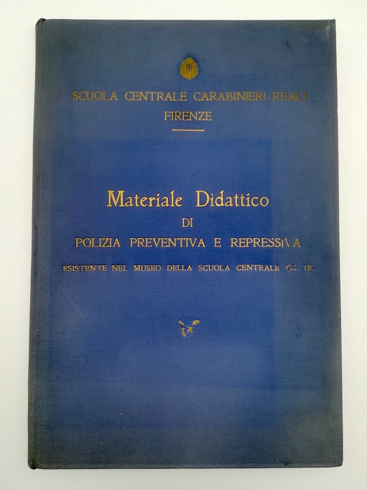In folio (cm 26 x 38), pp. 95 + (9) con 24 tavole con riproduzioni fotografiche in bianco/nero. Legatura editoriale in tela azzurra con titolo oro al piatto anteriore. Pubblicazione fuori commercio, di grande interesse, curata dalla Scuola Centrale dei Carabinieri Reali di Firenze, con un campionario fotografico del materiale didattico di polizia contenuto nel Museo criminale della Scuola stessa allo scopo di divulgare tra gli Ufficiali ed i militari dell’Arma la conoscenza specifica dei mezzi materiali comunemente adoperati nella perpetrazione del delitto. Sono presenti: Arnesi utilizzati a scopo di furto: trapano, pinze, chiavi inglesi, seghe, punteruoli, punte, fiaccole a benzina, bombole con acetilene, ossigeno, ossido di ferro, paletti vari, piè di porco, grimaldelli, guanti di gomma, diamante per tagliare il vetro, ecc…; effrazioni di casseforti (tavola con riproduzioni fotografiche); armi da sparo; congegni e materiale esplodente; ordini esplodenti a scopo terroristico; strumenti da punta o taglio e contundenti considerati armi agli effetti della legge penale; strumenti da punta o taglio atti ad offendere; strumenti di polizia medica, frodi fiscali, polizia tributaria, falsità in monete carte di pubblico credito; veleni e stupefacenti e giochi d’azzardo; astuzie di detenuti, corde e scale comunemente usate per evasioni; ecc…