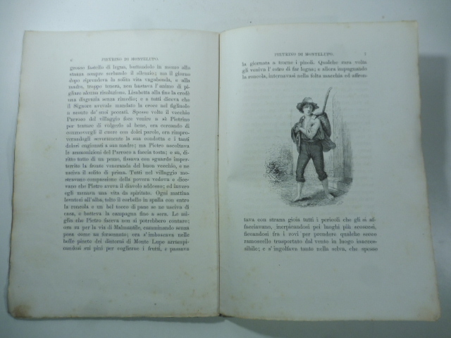 In 8 (cm 15 x 21,5), pp. 30 con illustrazioni in xilografia intercalate al testo. Brossura editoriale con dorso rifatto. Dedica autografa al frontespizio. Bruniture sparse alle pagine. “Semplice e grazioso racconto si è questo, pieno di verità, di grazie, di soave e cara virtù ed impresso ancora con singolare eleganza di tipi e con ornamento di belle incisioni in legno rispondenti al soggetto” (La civiltà cattolica, 1861, p. 735). Papanti, ‘Catalogo dei novellieri italiani’, p. 85.